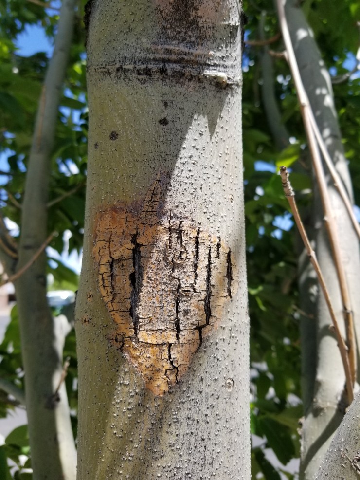 Cytospora is a fungus that affects many species of trees in our area. It is an opportunistic pathogen that infects stressed trees through bark wounds from pruning, insects or other broken limbs. Cytospora forms cankers that disrupt the vascular system of the tree. The fungus spreads until the tree’s defenses stop it or the tree is girdled and dies. Once a tree is infected, the best treatment is to increase vigor and remove infected limbs.